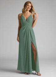 A-Line V-Neck Lace Chiffon Dress Sage Green Lace Back Maxi Dress with Side Slit Bridesmaid Dresses