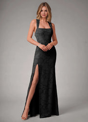Black Floral Jacquard Square Neck Maxi Dress with Side Slit and Crisscross Mermaid Pleated Burnout Convertible Bridesmaid Dresses black tie events, formal weddings, and upscale parties