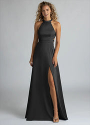 Black Halter Neck Maxi Dress with Crisscross Back and Side Slit A-Line High Stretch Satin Dress Bridesmaid Dresses