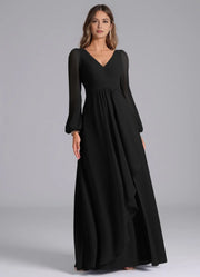 Black Long Sleeve V-Neck Maxi Dress with Side Slit and Open Back Black A-Line Long Sleeve Chiffon Dress Bridesmaid Dresses