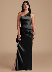 Black One-Shoulder Satin Maxi Dress with Ruffled Side Slit Sheath Metallic Satin Dress Bridesmaid Dresses