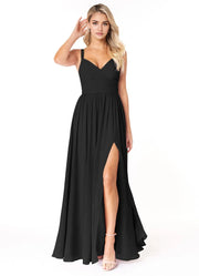 Black V-Neck Chiffon Maxi Dress with Side Slit and Thin Straps Black A-Line Pleated Chiffon Dress Bridesmaid Dresses tie events, formal weddings, and upscale parties