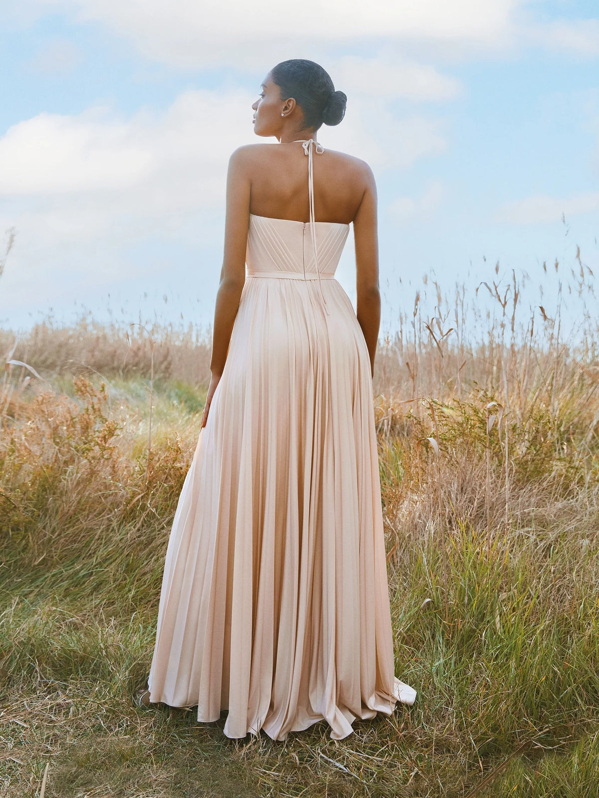 Blush Halter Neck Pleated Maxi Dress Party dress with delicate straps Bridesmaid Dresses black tie events, formal weddings, and upscale parties