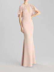 Blush Lace Cape Back Maxi Dress Mermaid party dress in crepe Bridesmaid Dresses black tie events, formal weddings, and upscale parties