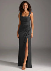 Charcoal Grey Square Neck Maxi Dress with Back Bow and Side Slit Sheath Bow Stretch Satin Dress Bridesmaid Dresses black tie events, formal weddings, and upscale parties