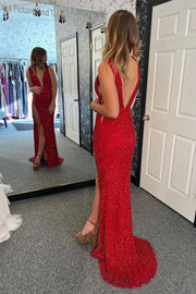 Charming Mermaid Red Sequins Long Prom Dresses with Slit