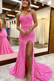 Cute Mermaid Sweetheart Pink Velvet Sequins Prom Dresses with Slit
