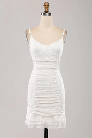 Cute Spaghetti Straps Bodycon Pleated Lace Short White Graduation Dress