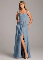 Dusty Blue Square Neck Maxi Dress with Side Slit Blue A-Line Side Slit Chiffon Dress Bridesmaid Dresses black tie events, formal weddings, and upscale parties