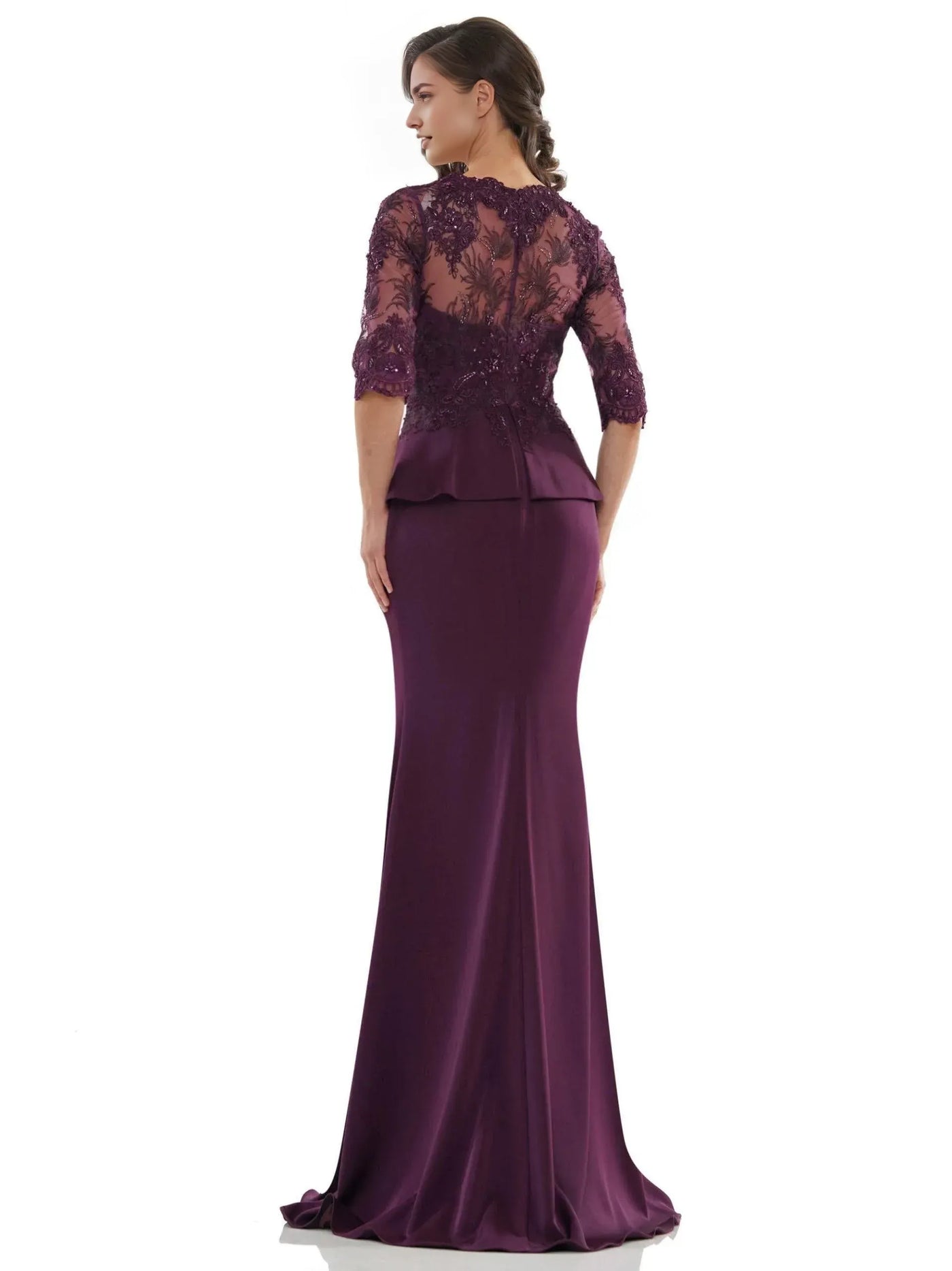 Shine at prom with this lush plum mermaid dress—featuring a V-neck, lace three-quarter sleeves, and a peplum waist detail. The sheer back adds subtle allure, balancing grace and sophistication, perfect for prom, formal dances, or evening galas. Pair with silver accessories to elevate its refined vibe.