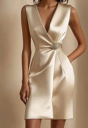 Elegant Satin Sleeveless Mini Dress V-Neckline Ivory Dress simple gentle atmospheric and unique desi Bring summer colors to enhance whiteness - US 2 / UK 6 / EU 32