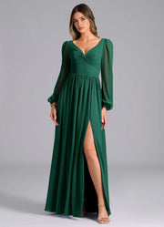 Emerald Green Long Sleeve Maxi Dress with Open Back and Side Slit A-Line Long Sleeve Chiffon Dress Bridesmaid Dresses