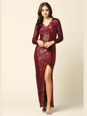 Shine at prom with this rich burgundy sequin sheath dress—featuring a V-neck, sleek long sleeves, and a chic high slit. The ruched back adds subtle texture, balancing glamour and sophistication, perfect for prom, formal dances, or evening galas. Pair with gold accessories to elevate its luxe vibe.