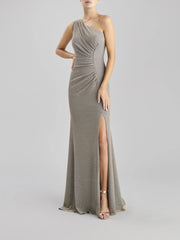 Gold One-Shoulder Ruched Maxi Dress with Side Slit Mermaid knit party dress Bridesmaid Dresses