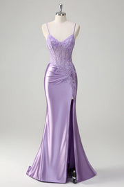 Lilac Floral Mermaid Corset Long Prom Dress with Slit
