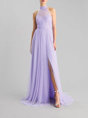 Lilac Halter Neck Tulle Maxi Dress with Side Slit A-line party dress with a halter neck Bridesmaid Dresses black tie events, formal weddings, and upscale parties