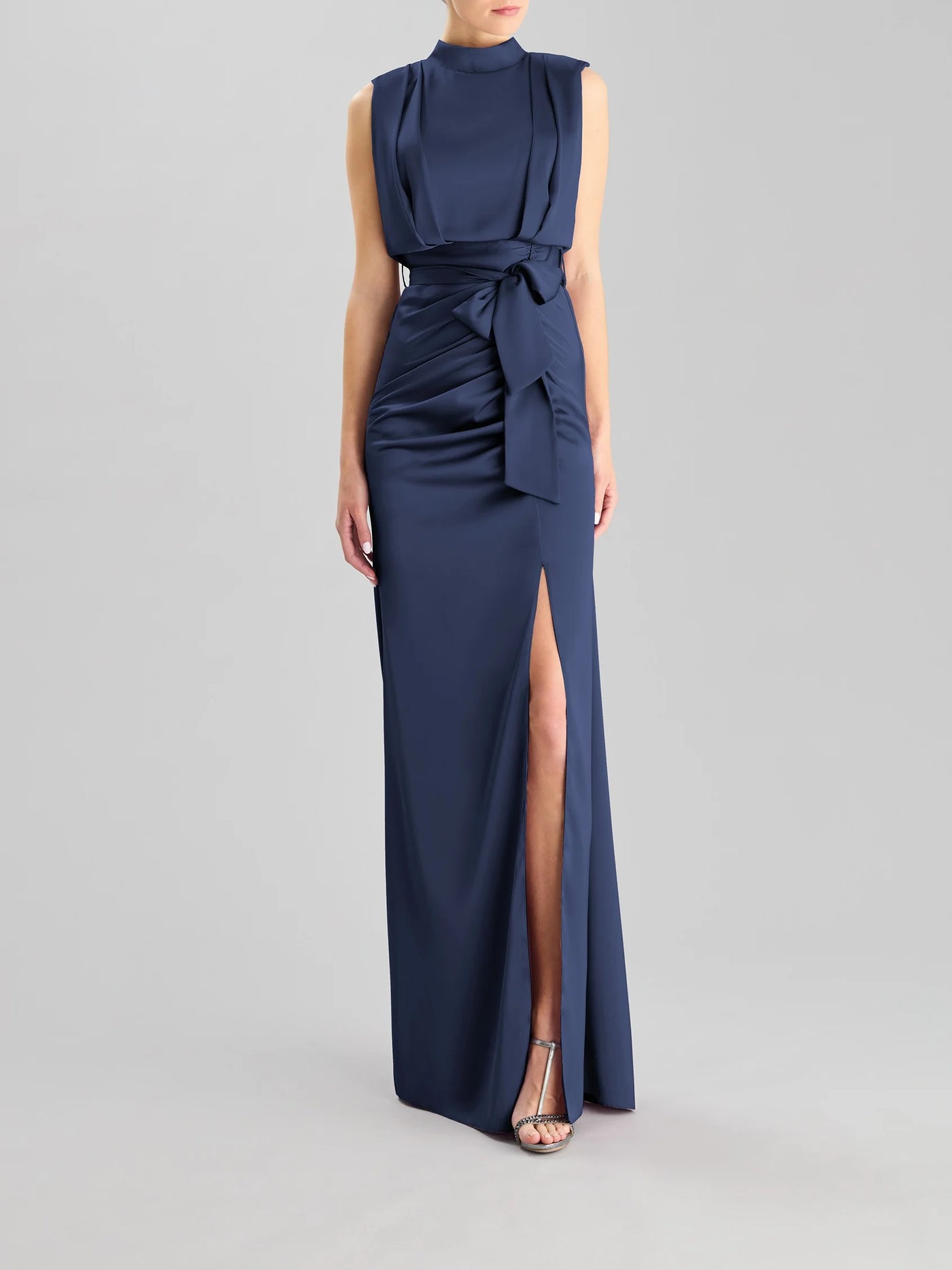Navy Blue High Neck Maxi Dress with Belted Slit High-neck sheath party dress Bridesmaid Dresses