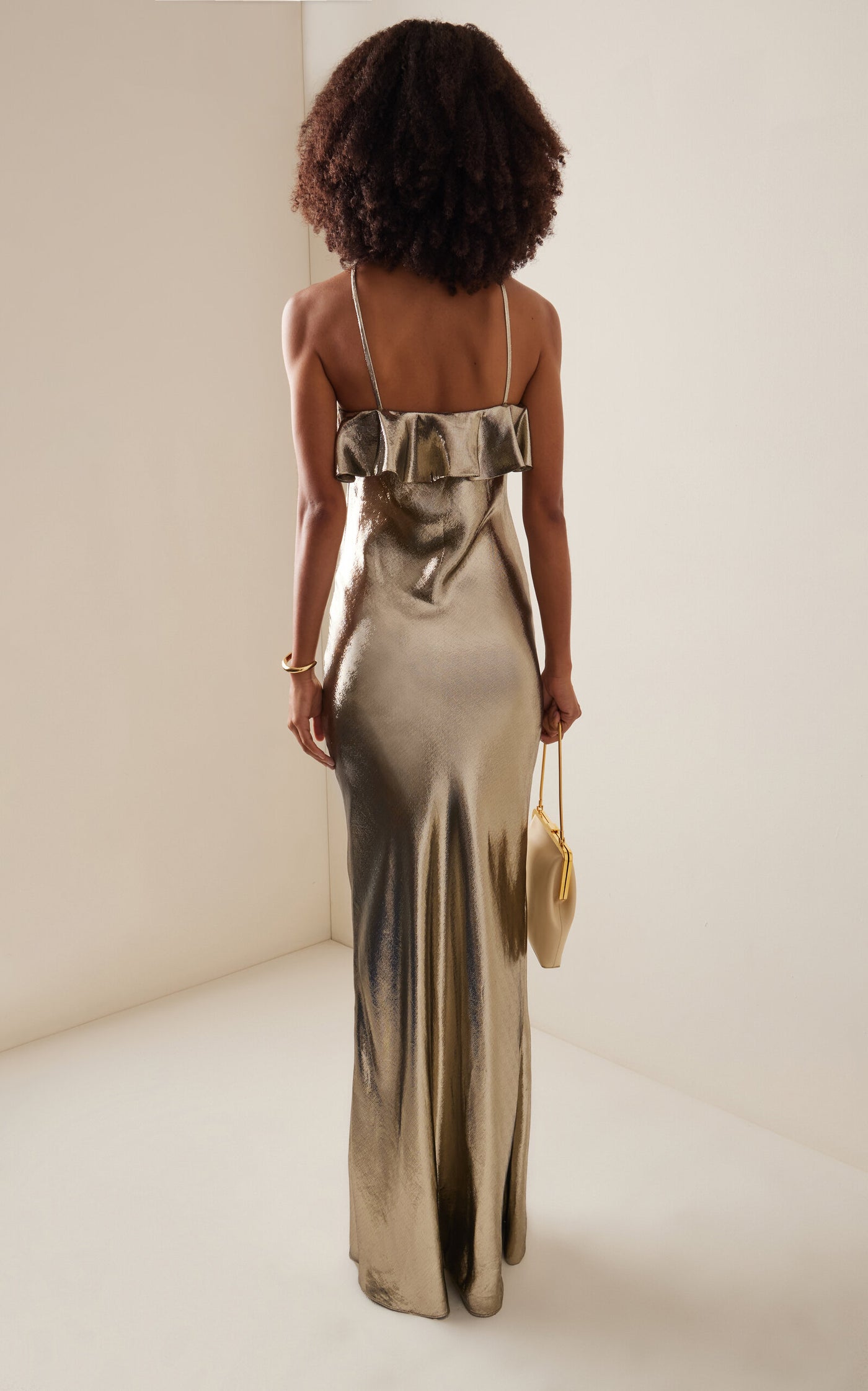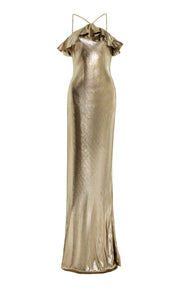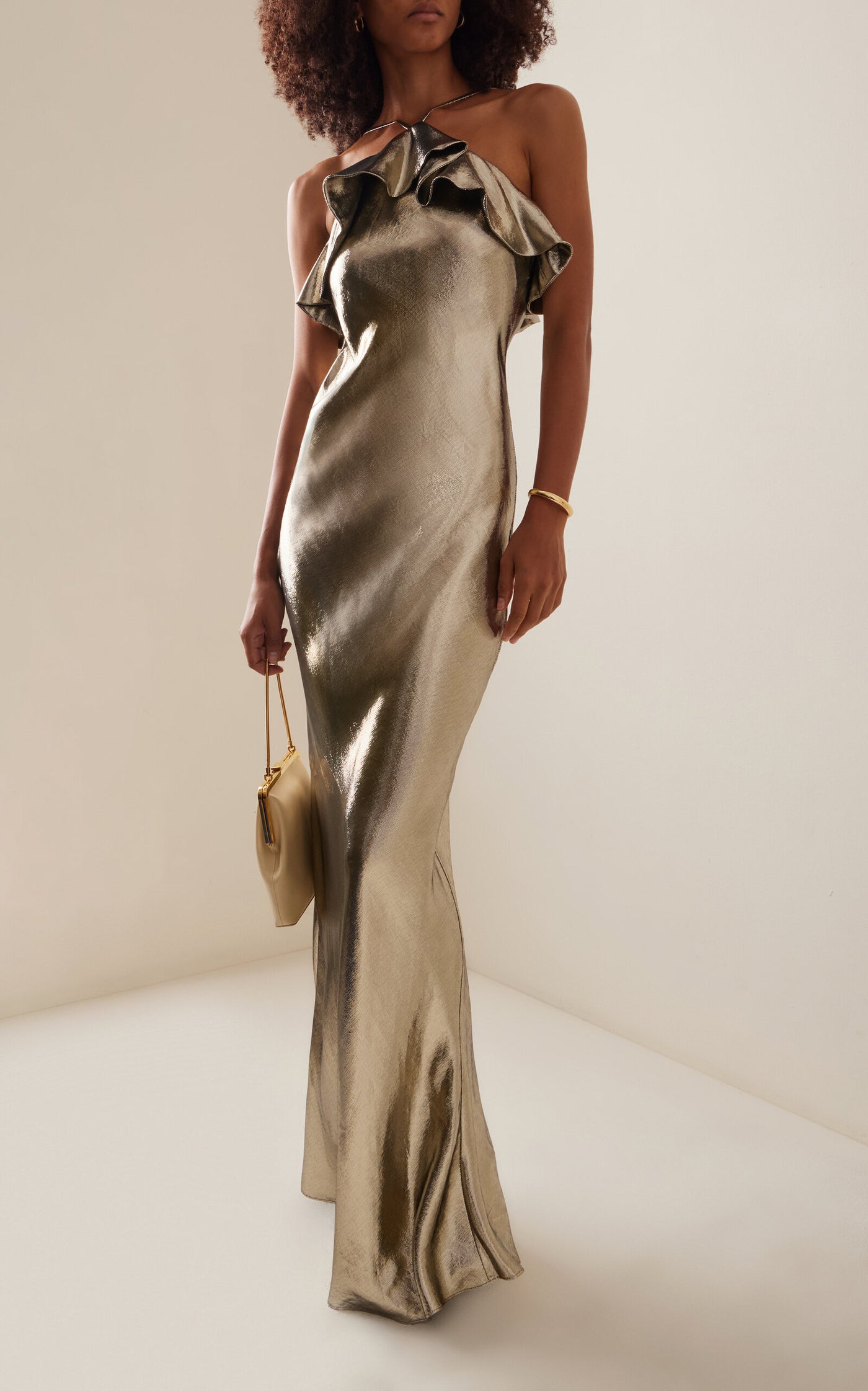 Party Dresses Ruffled Gold Lamé Halter Gown Gentle beautiful and grand