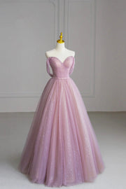Pink Off the Shoulder Tulle Sequins Evening Prom Dress Beautiful A-Line Party Dress simple gentle atmospheric and unique desi Bring summer colors to enhance white