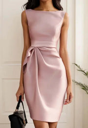 Pink Ruched Boat Neck Sleeveless Satin Sheath Midi Dress simple gentle atmospheric and unique desi Bring summer colors to enhance whiteness