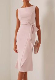 Pink Ruched Boat Neck Sleeveless Sheath Midi Dress simple gentle atmospheric and unique desi Bring summer colors to enhance whiteness