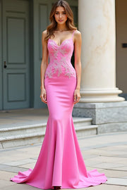 Pink Sheath Spaghetti Straps Satin Long Prom Dress with Appliques simple gentle atmospheric and unique desi Bring summer colors to enhance whiteness