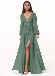 Sage Green Long Sleeve V-Neck Maxi Dress with Side Slit and Open Back Eucalyptus A-Line V-Neck Long Sleeve Chiffon Bridesmaid Dresses black tie events, formal weddings, and upscale parties