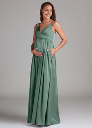 Sage Green Maternity Maxi Dress with Spaghetti Straps Stretch Satin Floor-Length Dress with Pockets Eucalyptus Bridesmaid Dresses black tie events, formal weddings, and upscale parties