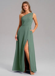 Sage Green One-Shoulder Chiffon Maxi Dress with Side Slit and Pockets Eucalyptus A-Line One Shoulder Chiffon Dress Bridesmaid Dresses