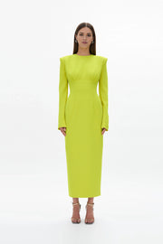This prom dress features a sheath silhouette with structured fabric for a sharp, tailored look. The crew neck padded shoulder design add a distinct touch, while the zipper back ensures a secure fit. The sleek cut maintains a refined shape, making it ideal for prom events keeping the wearer confident and eye-catching.
