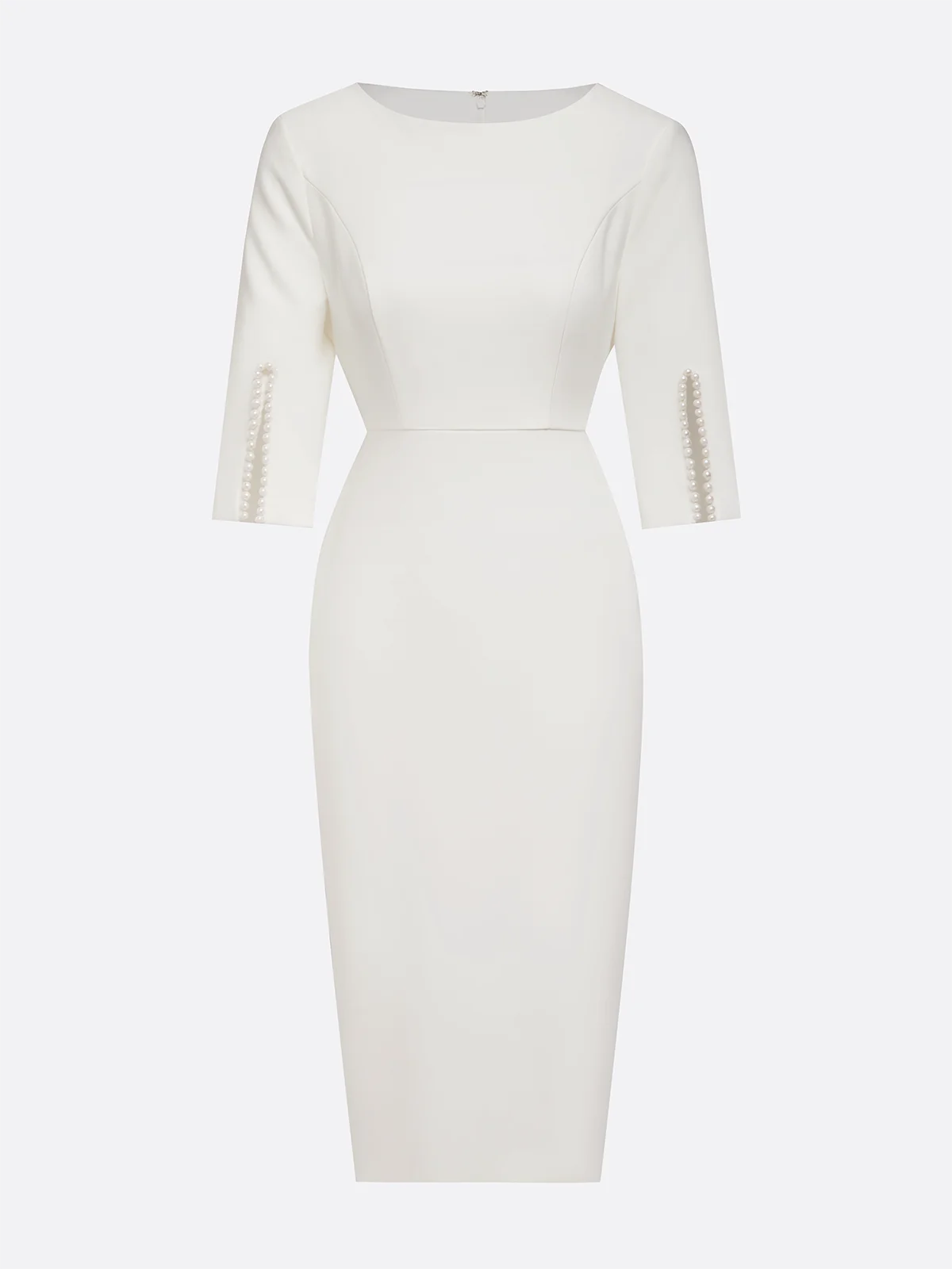 White Imitation Pearls Classic Crew Neck Half Sleeve Sheath Midi Dress