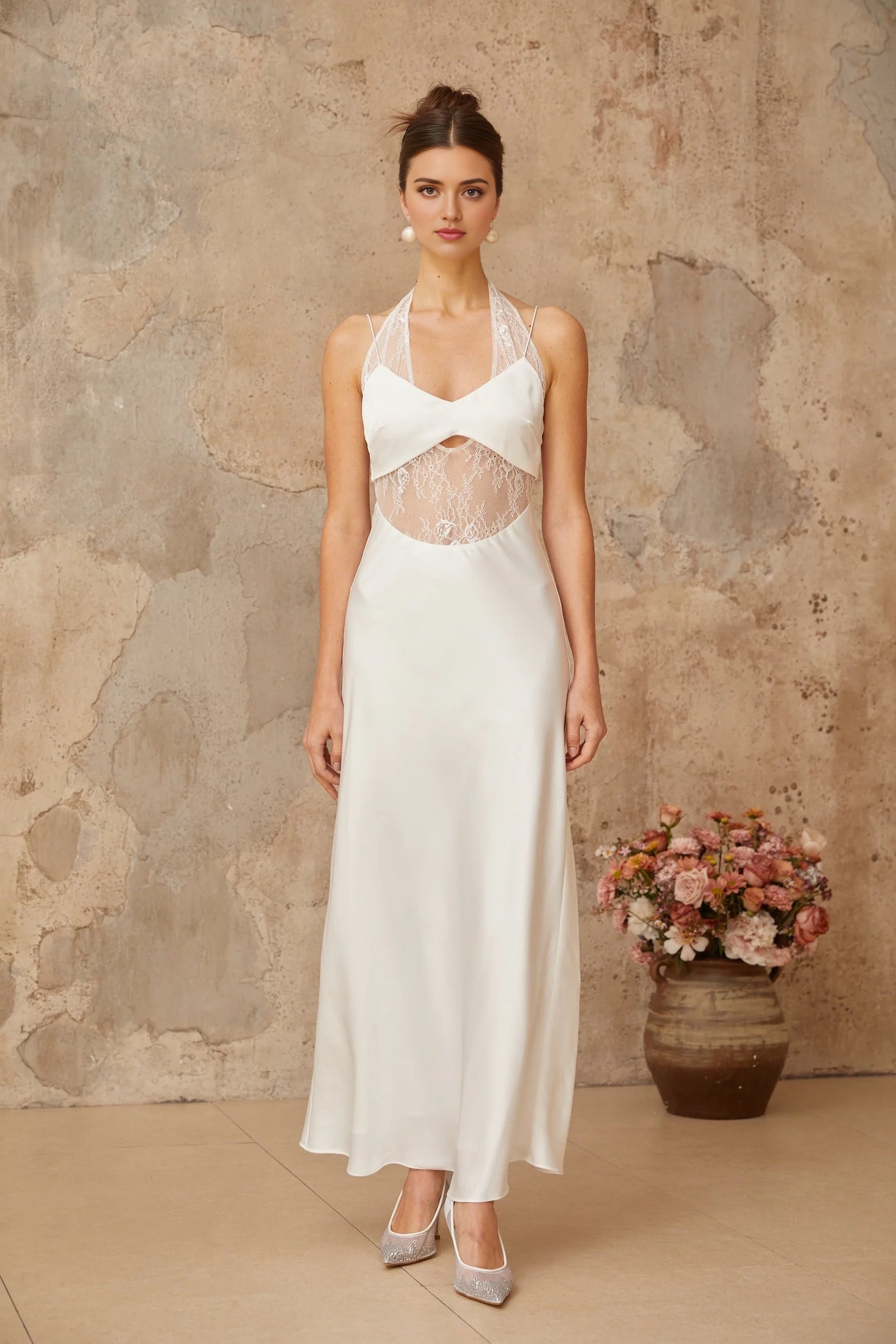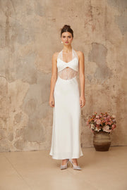 White Lace Cut - Out Halter Neck Maxi Dress Blanche white lace-panel satin maxi dress Evening Dress Prom, black tie events, formal weddings, and upscale parties