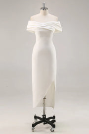 White Off the Shoulder Sheath Satin Asymmetrical Graduation Dress