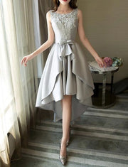 Light gray dress with sleeveless round neck, lace embroidery, high waist and bow decoration, suitable for light social occasions such as dinners and parties Prom, black tie events, formal weddings, and upscale parties