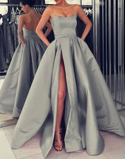 This light gray satin dress features a strapless design and a high-waisted slit skirt, offering an elegant silhouette ideal for dinners, dances, and special occasions. The smooth satin fabric adds a subtle sheen, enhancing its sophisticated appeal while ensuring comfort throughout your event.