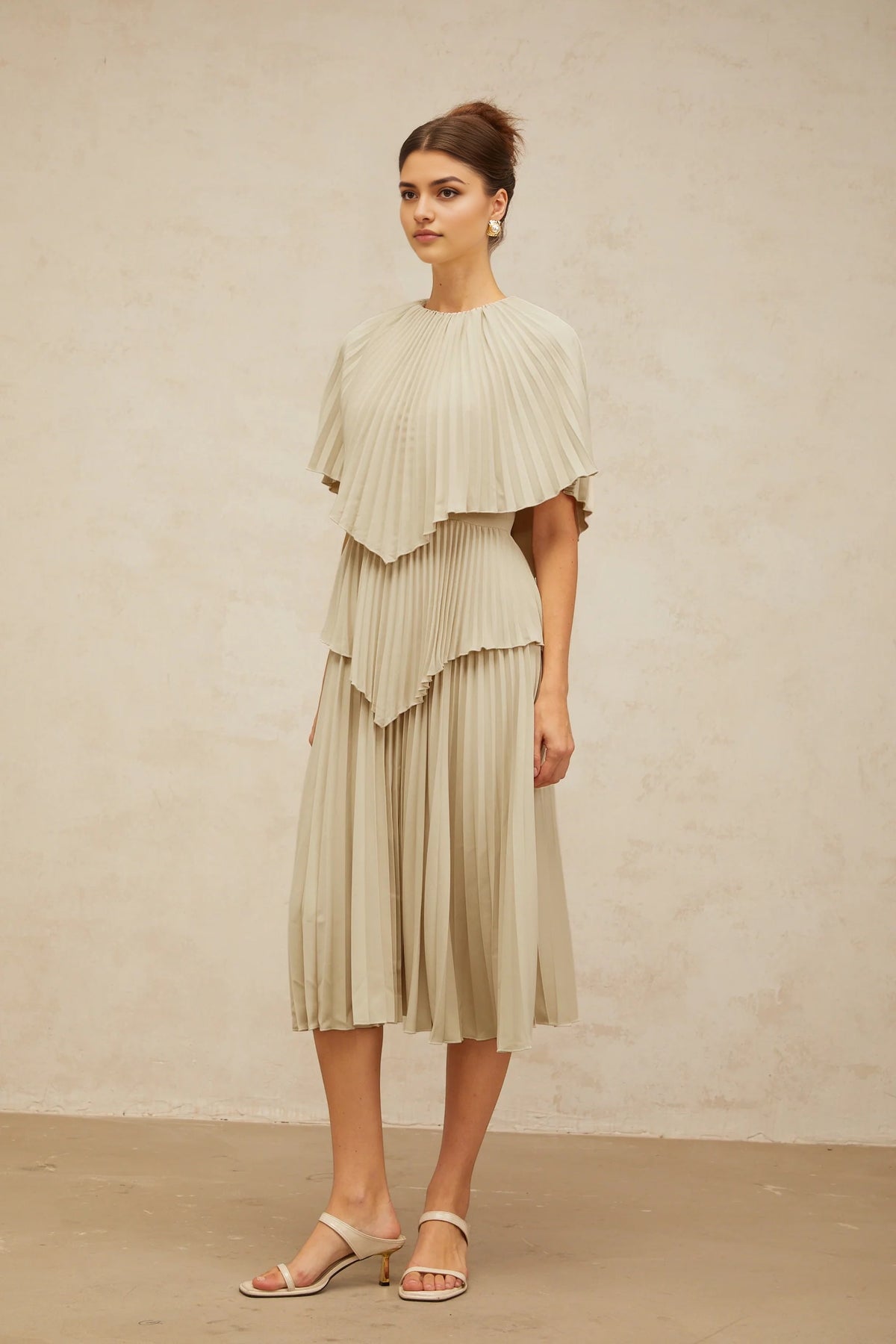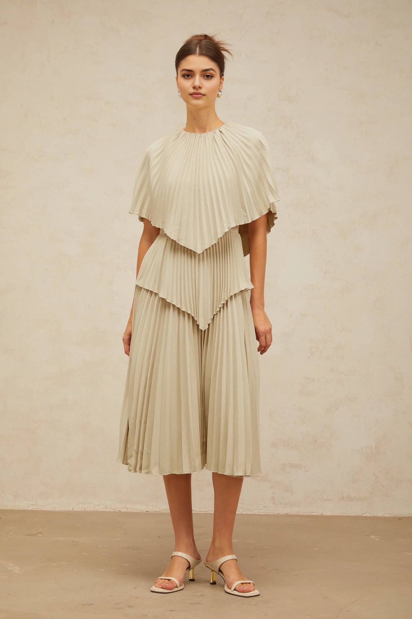 Elevate your elegance with this Beige Pleated Layered Midi Dress. It features a cape - like top with pleats, layered pleated design down to the midi skirt, and a subtle side slit for movement. Perfect for formal events, dinners, or any occasion where you want to showcase refined and chic style.