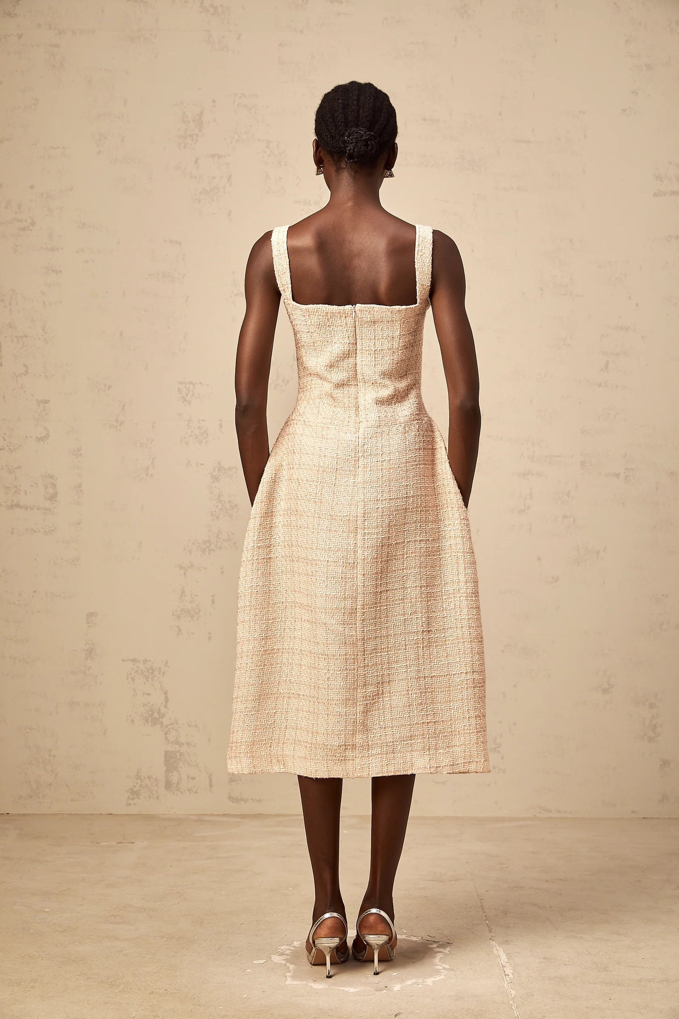 Beige Tweed Embroidered Midi Dress neutrals interwoven embroidered mini dress Evening Dress black tie events, formal weddings, and upscale partie