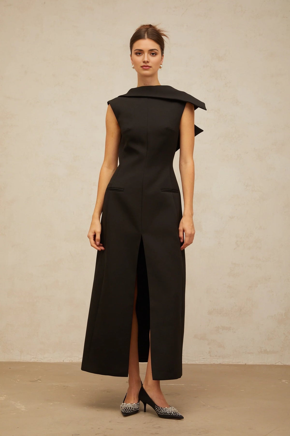Exude avant - garde elegance with this Black Draped Collar Open - Back Midi Dress. It features a dramatic draped collar, an alluring open back, and a high - slit skirt. Perfect for evening galas, art events, or any occasion where you want to showcase bold sophistication.