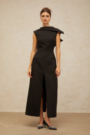 Black Draped Collar Open - Back Midi Dress black deconstructed open-back midi dress Evening Dress