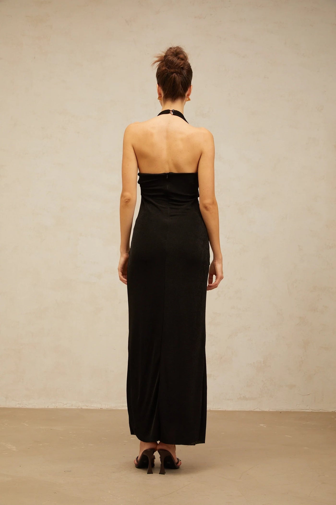 Black Halter Neck Maxi Dress with Gold Embellishments black ruched halterneck maxi dress Evening Dress Prom, black tie events, formal weddings, and upscale parties