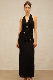 Black Halter Neck Maxi Dress with Gold Embellishments black ruched halterneck maxi dress Evening Dress - US 2 / UK 6 / EU 32
