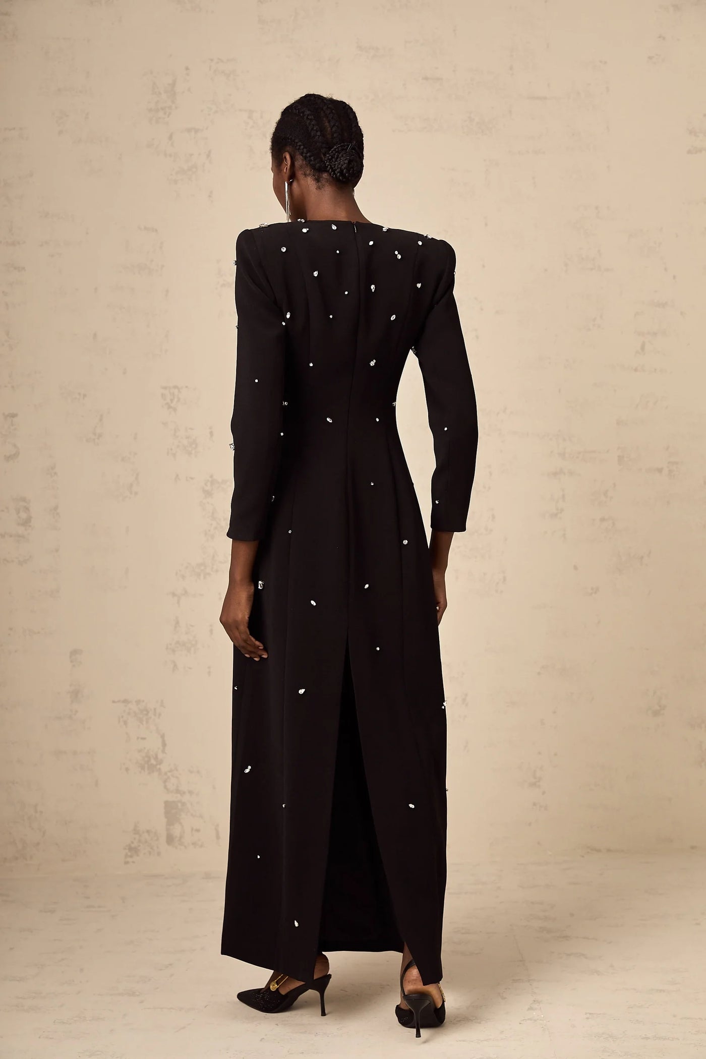 Black Long Sleeve Maxi Dress with Crystal Embellishments Imelda black crystal-embellished maxi dress Evening Dress Prom, black tie events, formal weddings, and upscale parties
