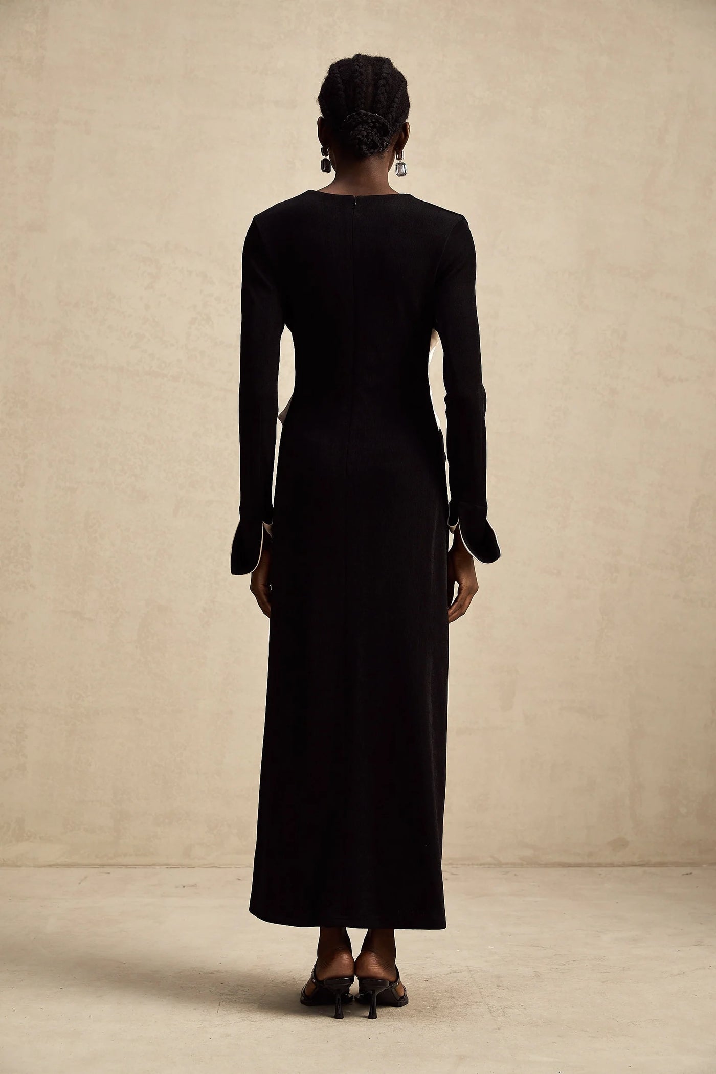 Black Maxi Dress with Cream Contrast Belt and Cuffs Karine contrast-color bowknot v-neck maxi dress Evening Dress