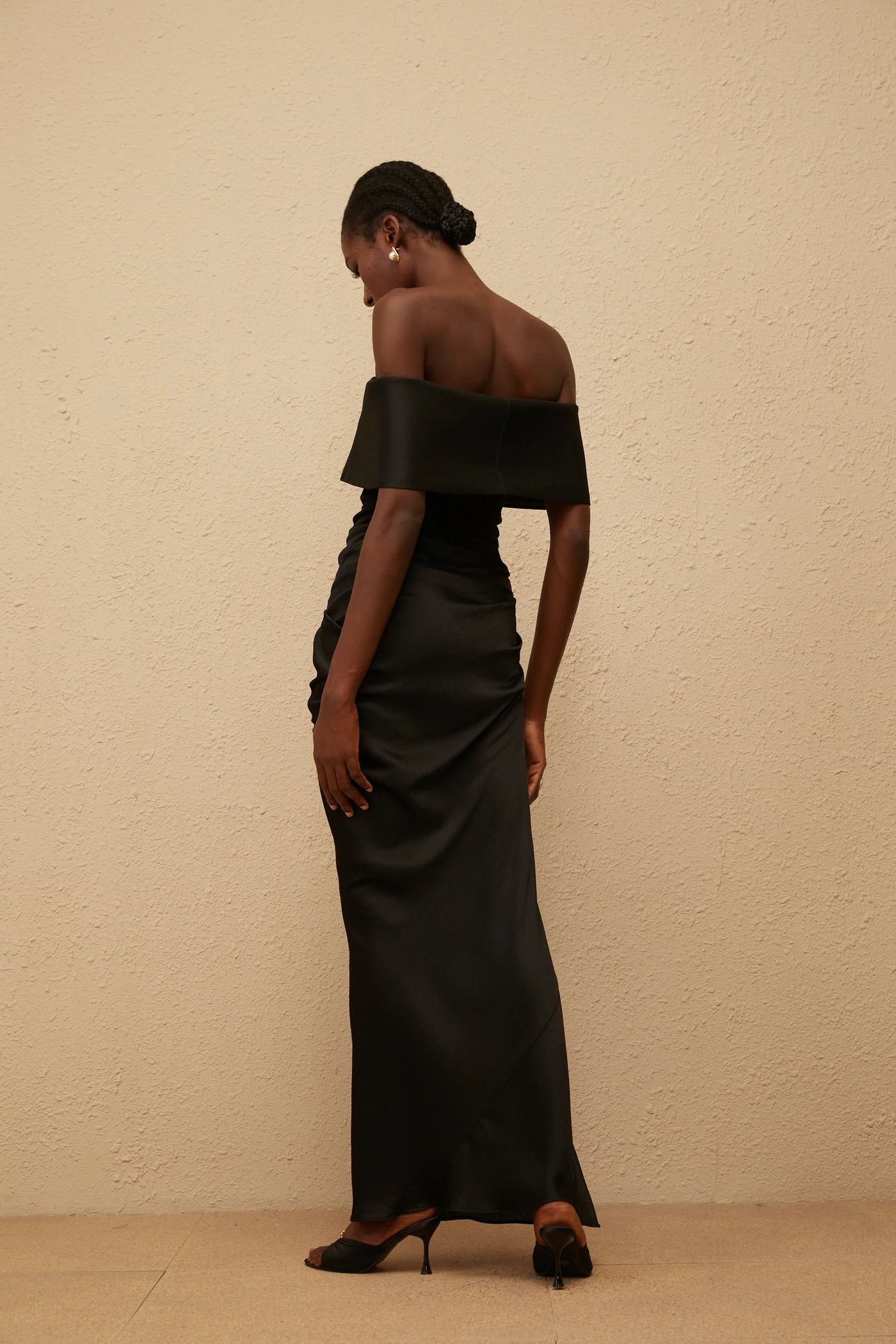 Black Off - Shoulder Ruched Maxi Dress Black Off-Shoulder Satin Maxi Dress