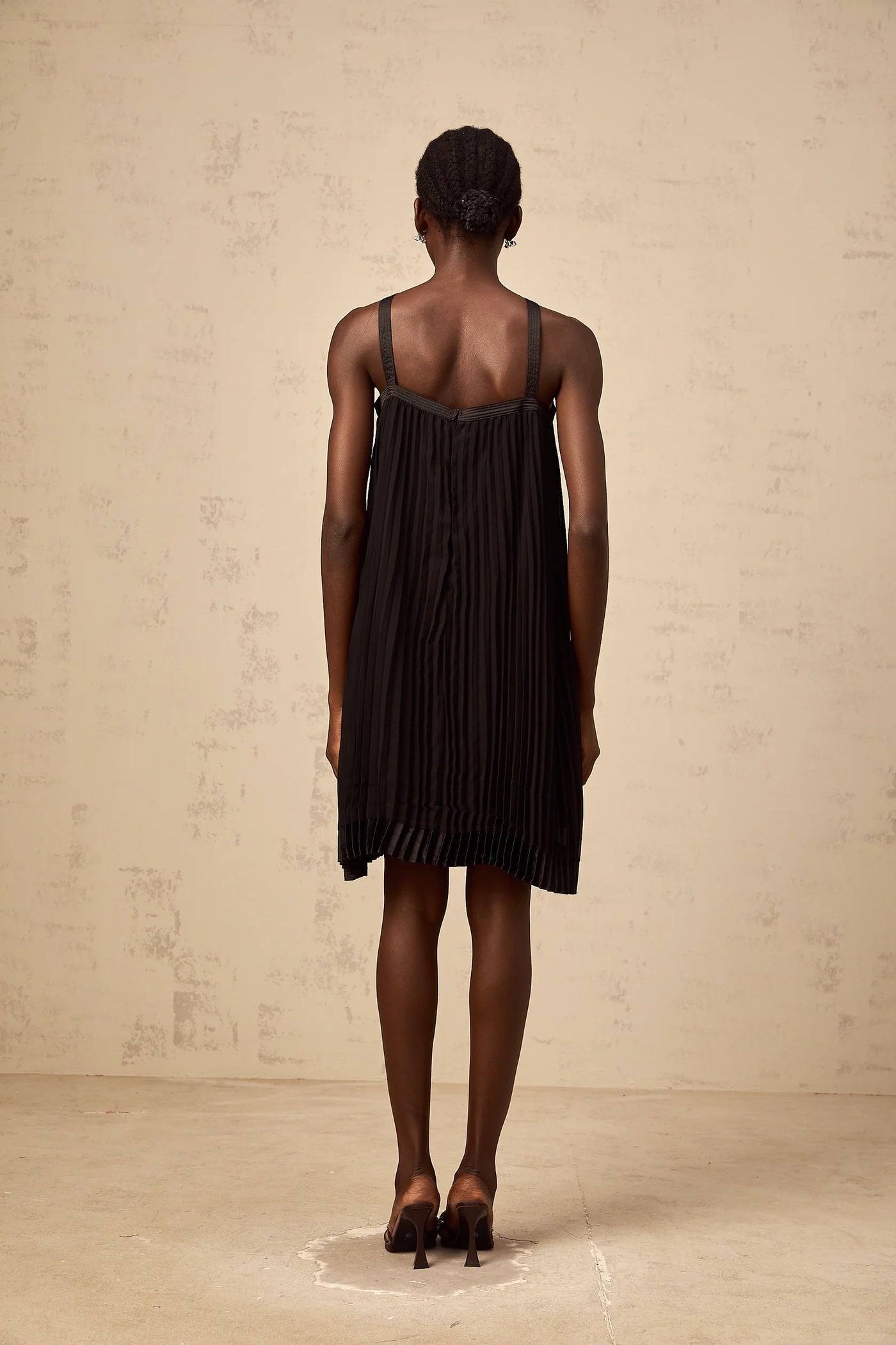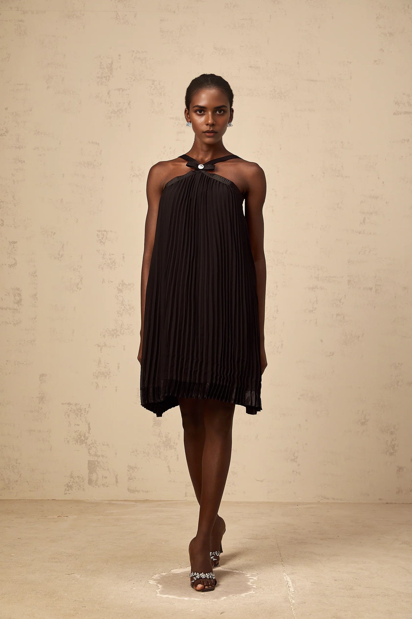 Elevate your style with this Black Pleated Halter Neck Mini Dress. It features a halter neckline with a charming bow accent, delicate pleats throughout, and a flirty mini - length silhouette. Perfect for parties, dinners, or nights out, this dress combines sophistication and playful charm.