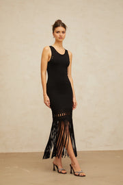Black Sleeveless Maxi Dress with Fringe Hem Paola black fringed fitted knit midi dress Evening Dress Prom, black tie events, formal weddings, and upscale parties
