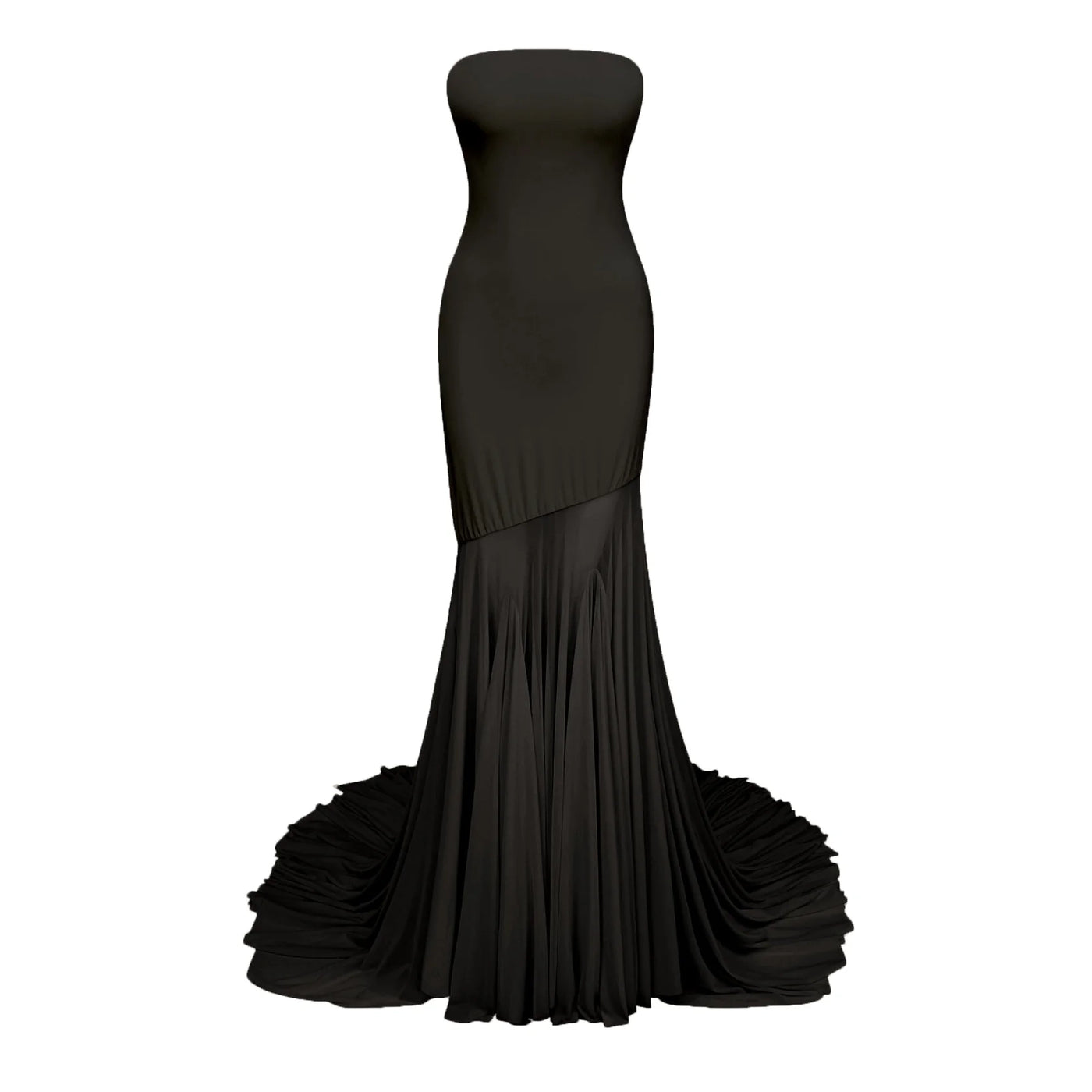 Black Strapless High - Low Maxi Dress with Dramatic Train Black Off-shoulder Sheer Tulle Maxi Dress Evening Dress