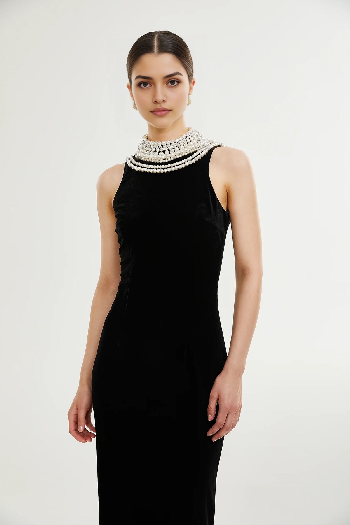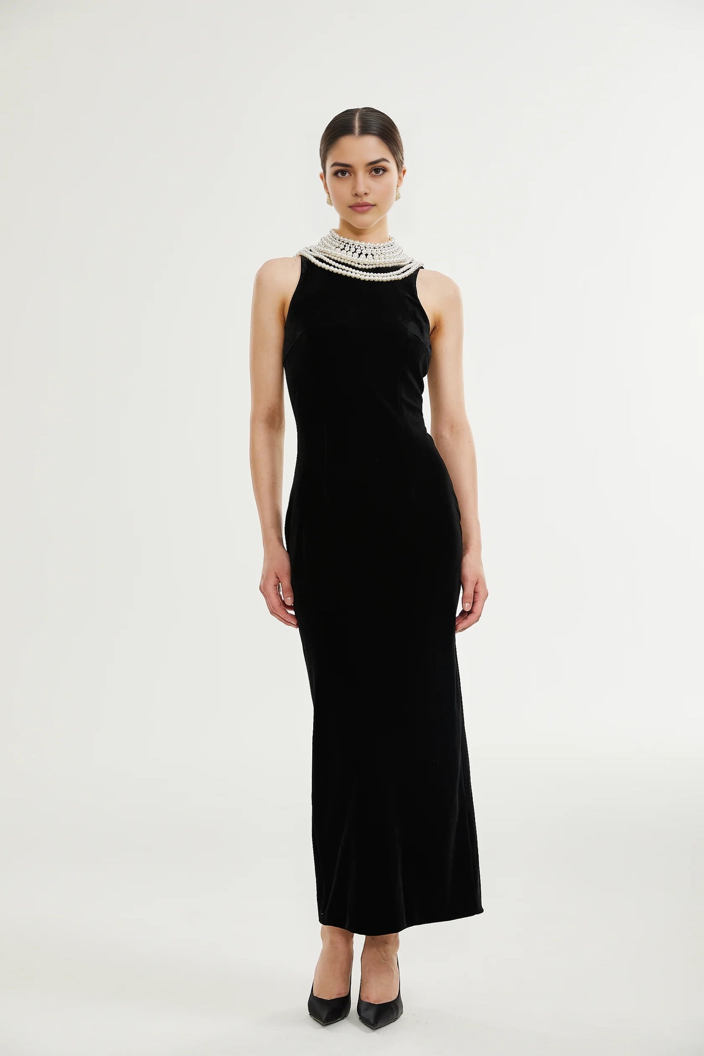 Black Velvet Maxi Dress with Pearl Embellished Neckline Lucena faux pearl-embellished velvet dress Evening Dress Prom, black tie events, formal weddings, and upscale parties