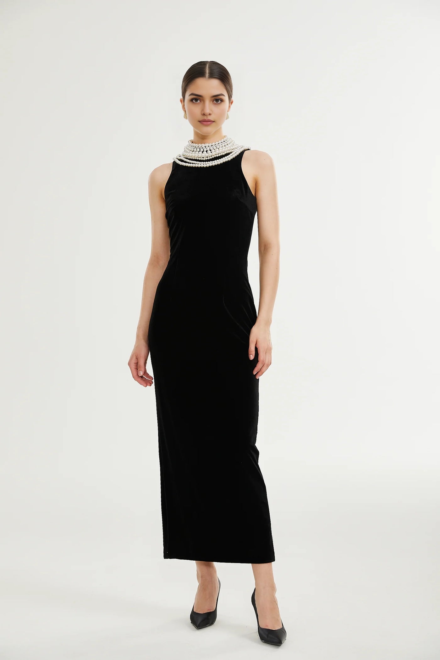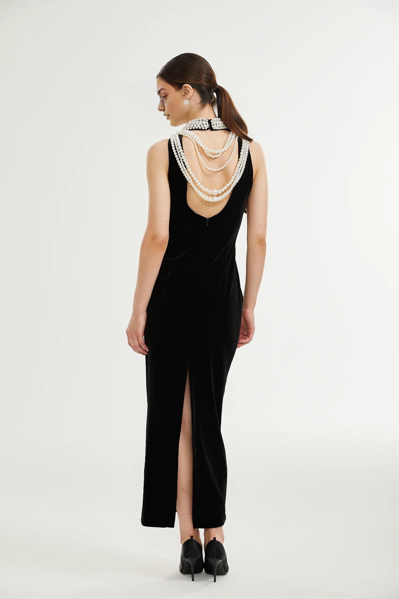 Exude vintage glamour with this Black Velvet Maxi Dress. It features a luxurious velvet fabric, an eye - catching pearl - embellished neckline that drapes elegantly down the back, and a sleek maxi silhouette with a side slit for movement. Perfect for formal events, galas, or any occasion where you want to showcase timeless elegance.