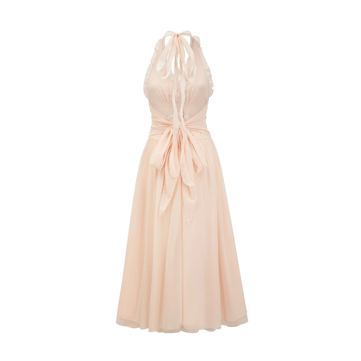 Embrace romantic elegance with this Blush Pink Halter Neck Maxi Dress. It features a halter neckline, a delicate floral accent at the chest, and a stunning open back with a tie detail. The flowing chiffon fabric and maxi length create a dreamy silhouette, perfect for weddings, bridal showers, or any special occasion where you want to radiate feminine charm.